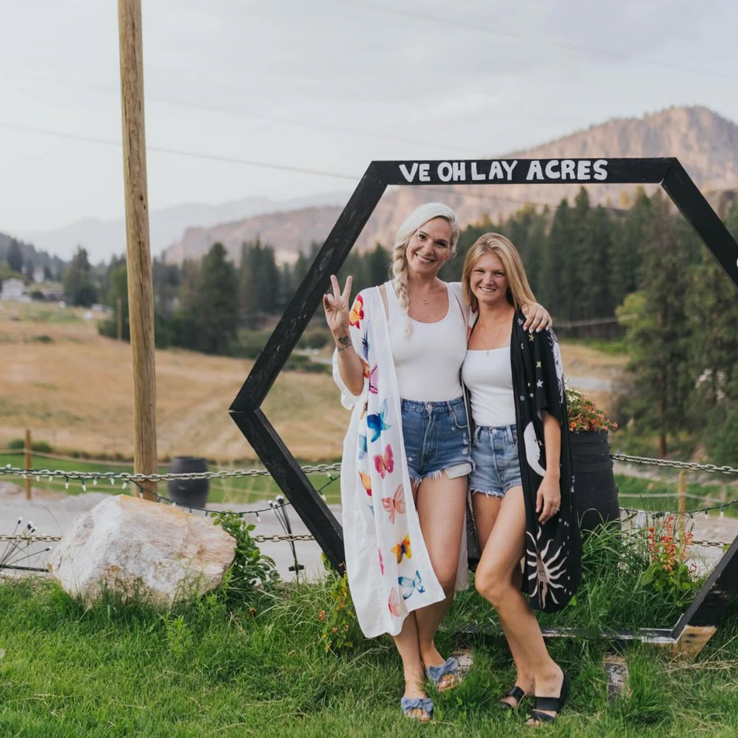 Woman standing in vineyard with trees and a farm in the background